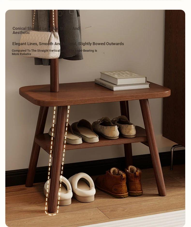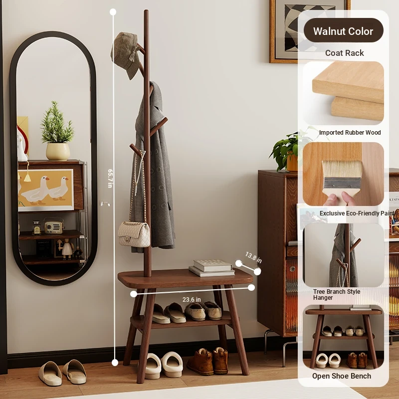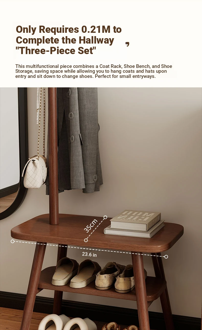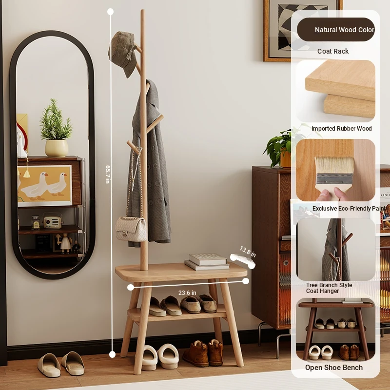23.62in Wood Color [Shoe Changing Stool + Coat Rack + Shoe Rack] - Delivered to Your Door