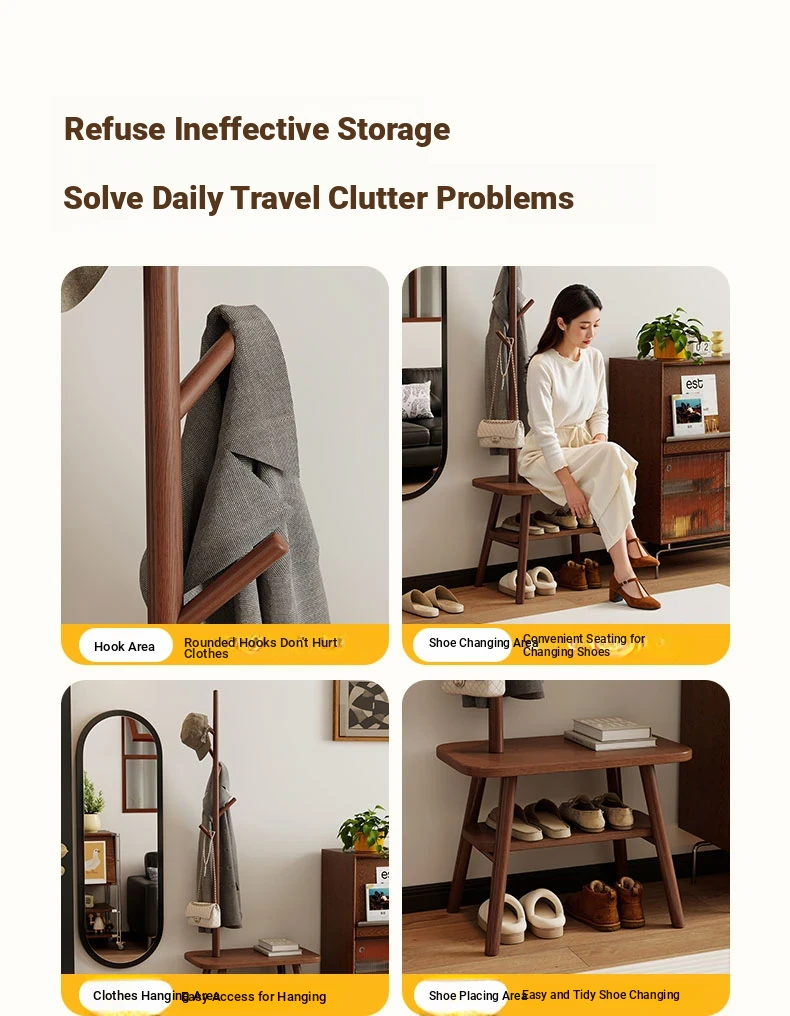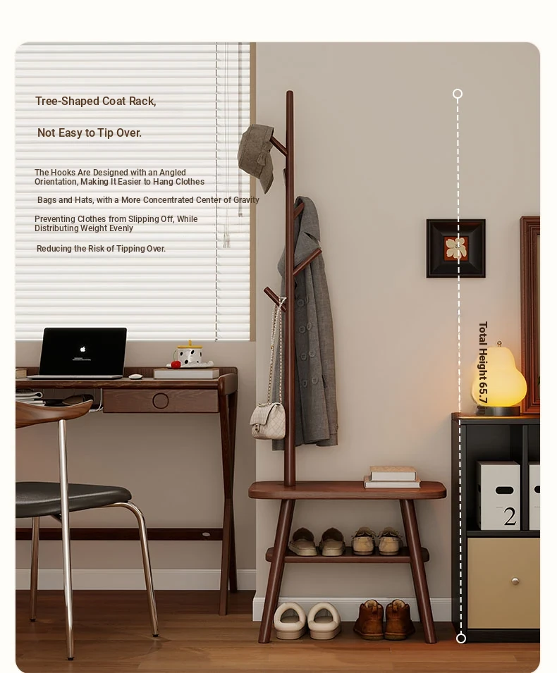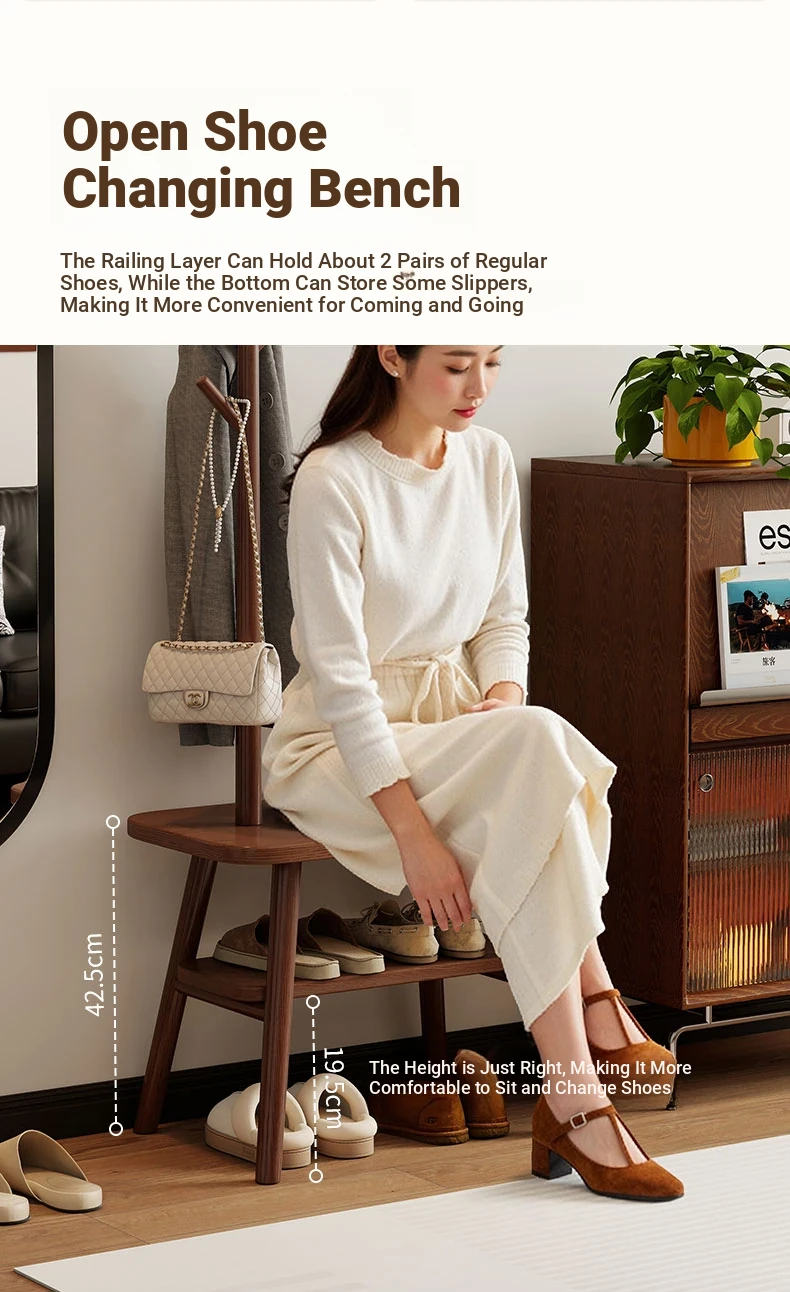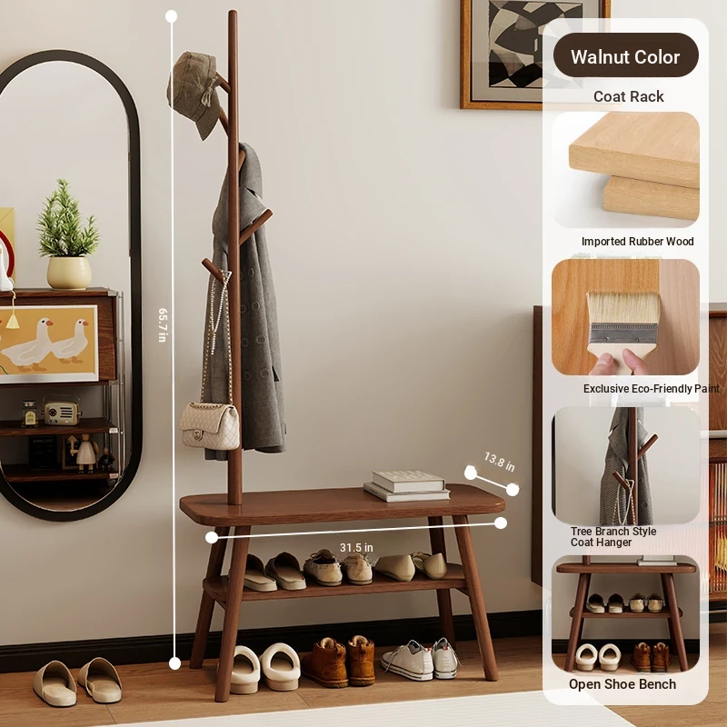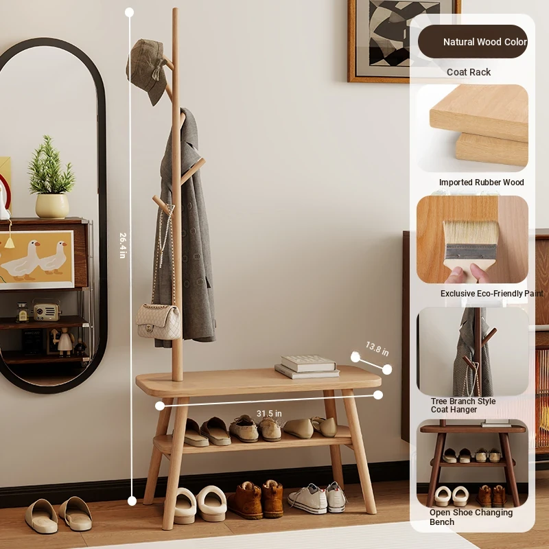 31.50in Wood Color [Shoe Changing Stool + Coat Rack + Shoe Rack] - Delivered to Your Door