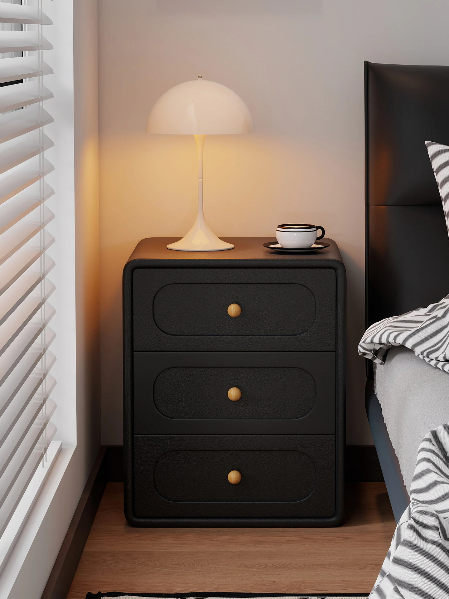 Elegant Black Solid Wood Nightstand - Modern Minimalist Three-Tier Bedside Storage Cabinet for Luxurious Bedrooms, Perfect for Organizing Essentials with a Creative Touch.