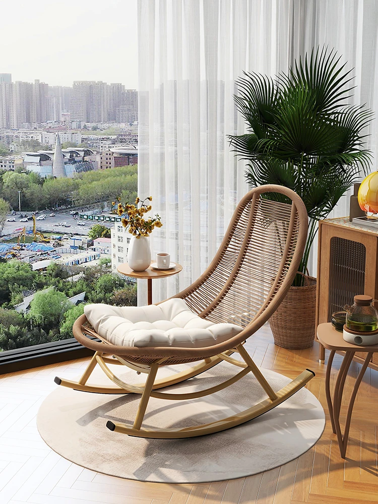Outdoor Rattan Rocking Chair for Home Use - Cozy Recliner for Balcony, Living Room, and Leisure Time - Comfortable Single Seat Lazy Sofa for Adults' Afternoon Naps
