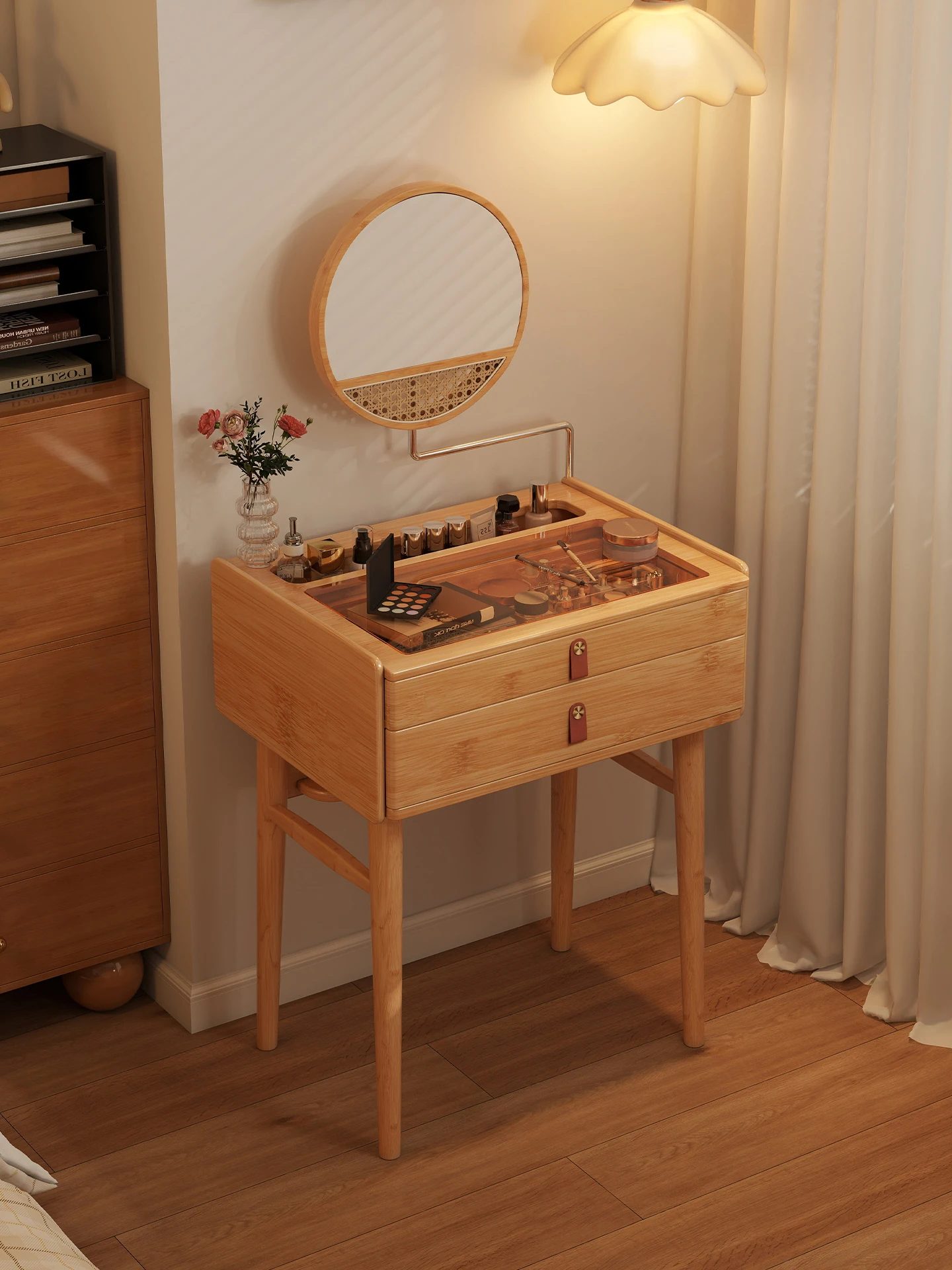 Modern Japanese Style Wooden Vanity Table – Minimalist Makeup Desk with Mirror and Storage, Perfect for Bedroom and Home Office Use