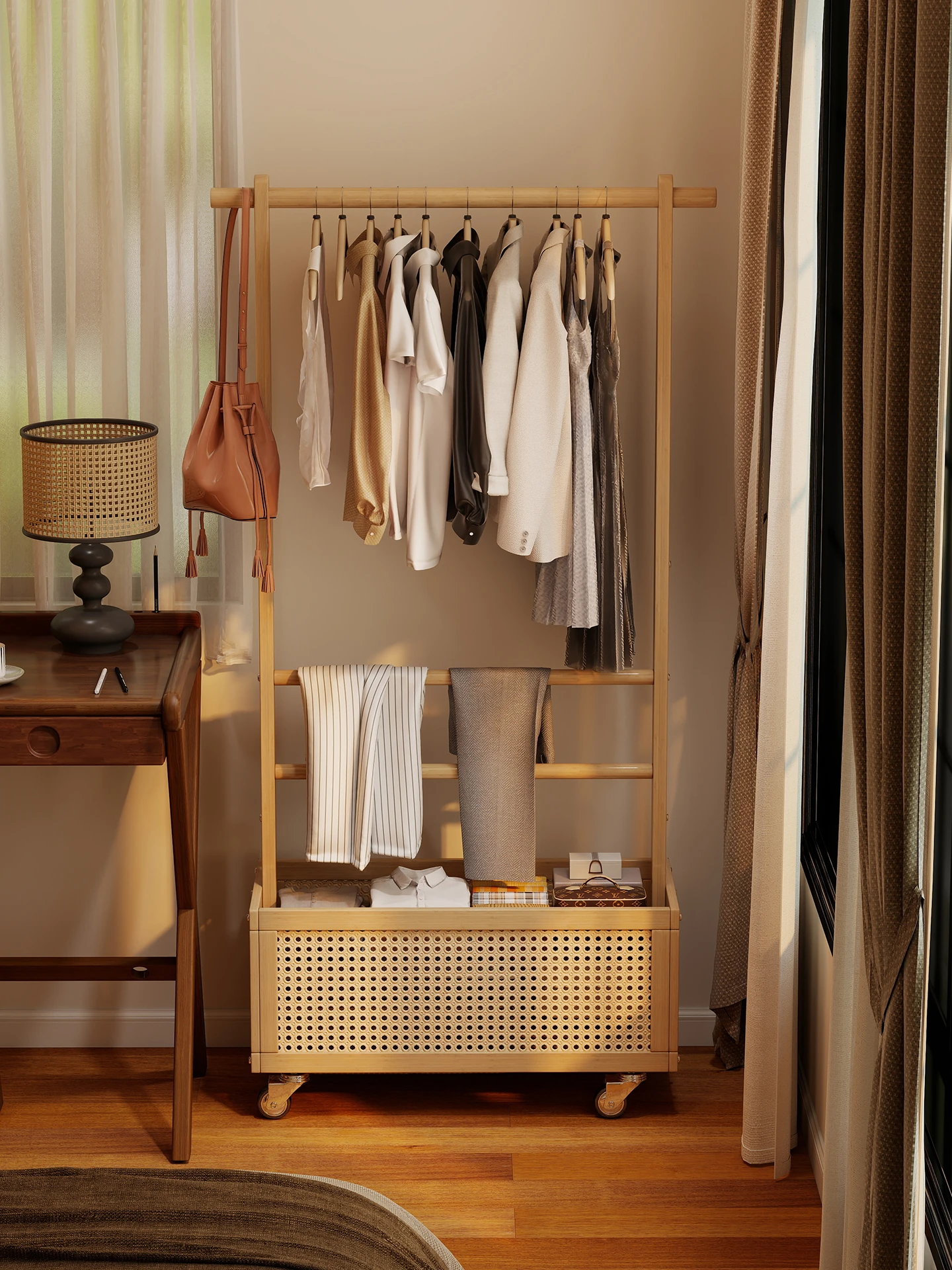 Minimalist Retro Rattan Floor Coat Rack - Easy Assembly Multi-Functional Wardrobe and Storage Cabinet for Small Spaces