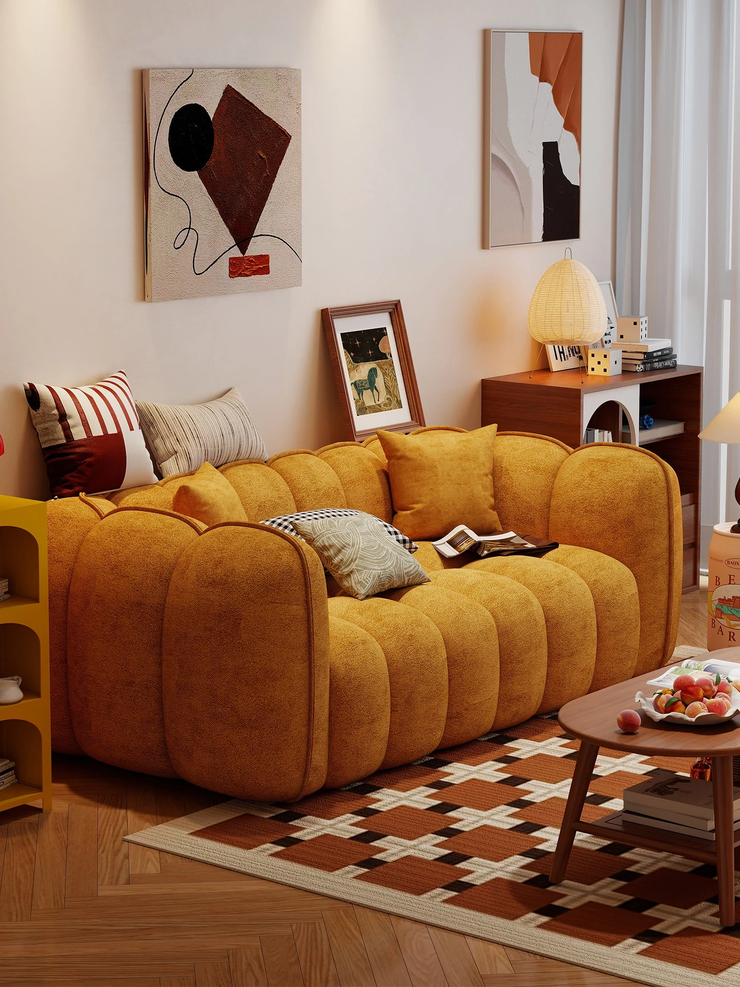 French Vintage Pumpkin Sofa for Small Living Rooms - Minimalist Cream Style Fabric Couch for Home Use, Perfect for Airbnb and Cozy Spaces, 2-Seater Design
