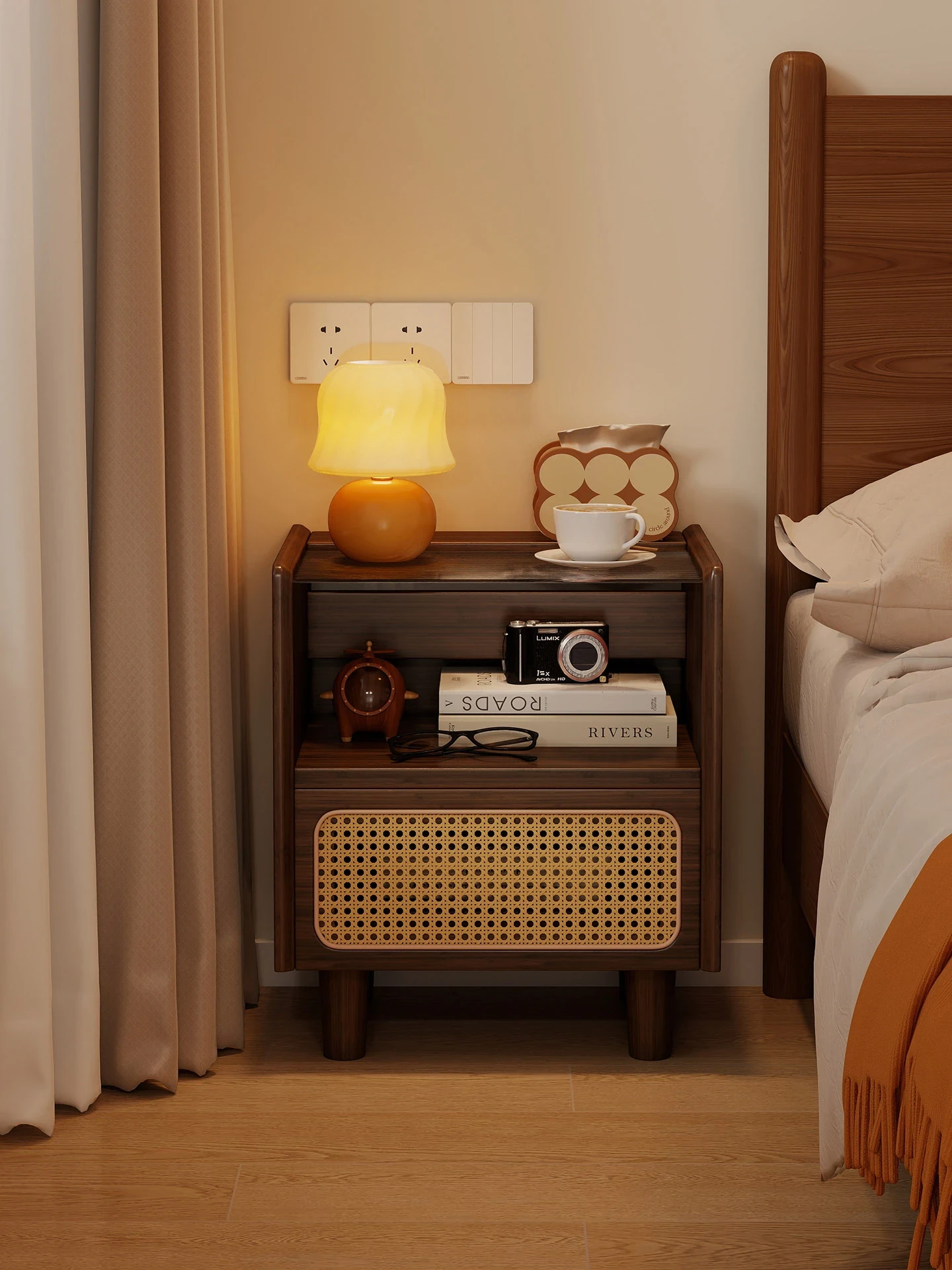 Japanese Style Wooden Nightstand with Rattan Weaving - Modern Minimalist Glass Bedside Storage Cabinet for Bedroom, Perfect for Organizing Essentials and Adding Elegance to Your Space.