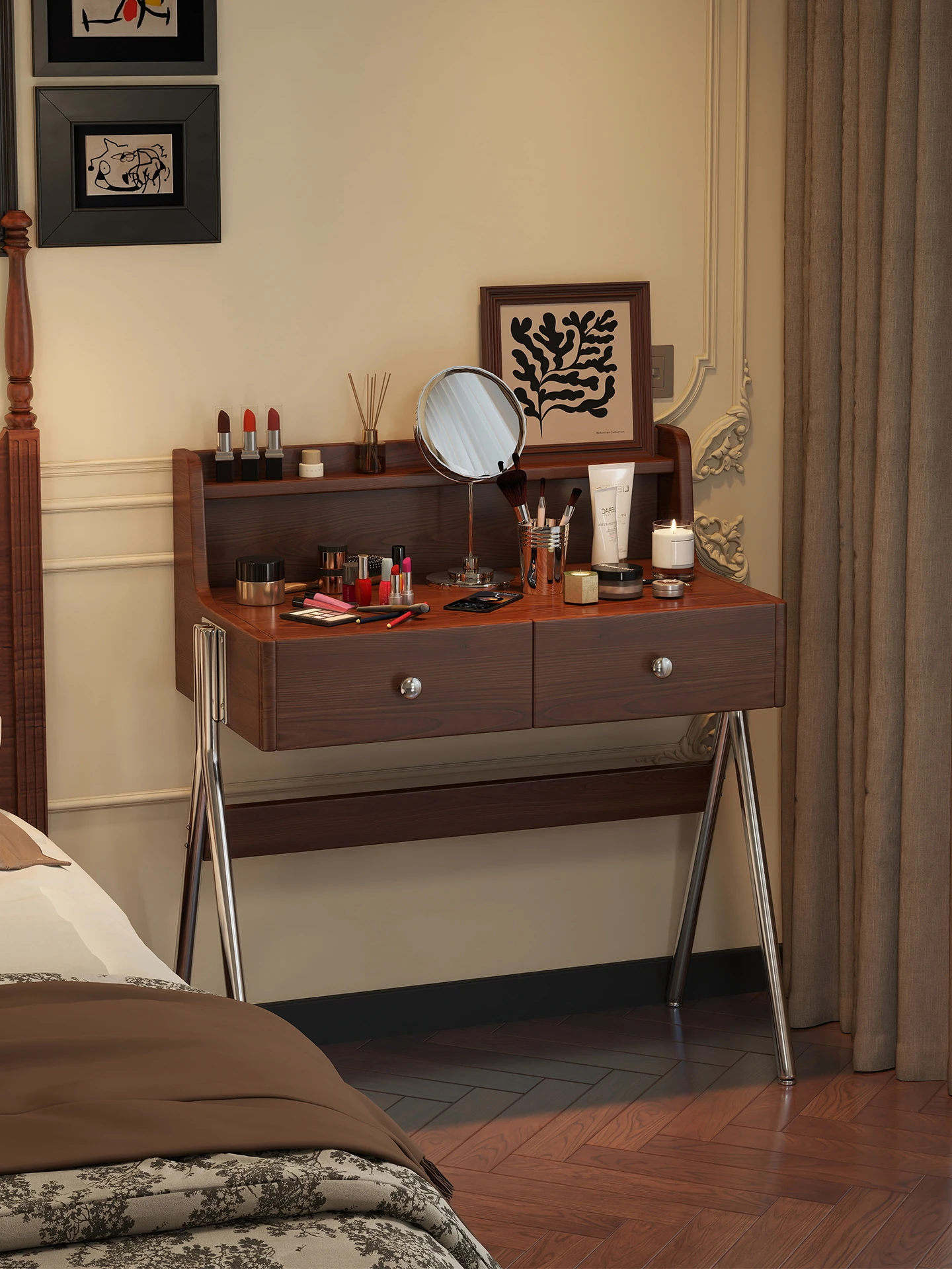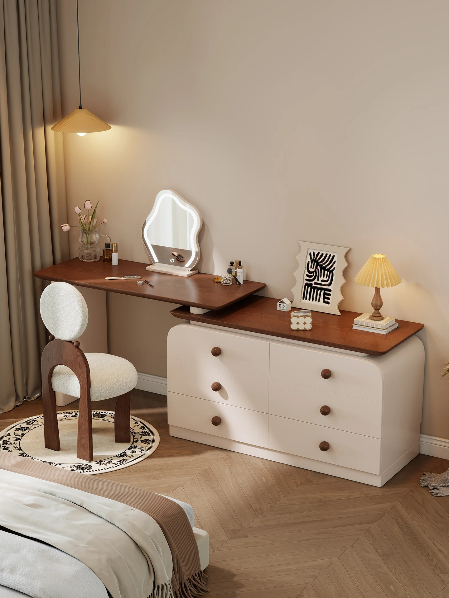 Vintage Solid Wood Corner Dressing Table with Integrated Dresser - Minimalist Makeup Desk and Storage Cabinet for Master Bedroom, Perfect for Bed End Use