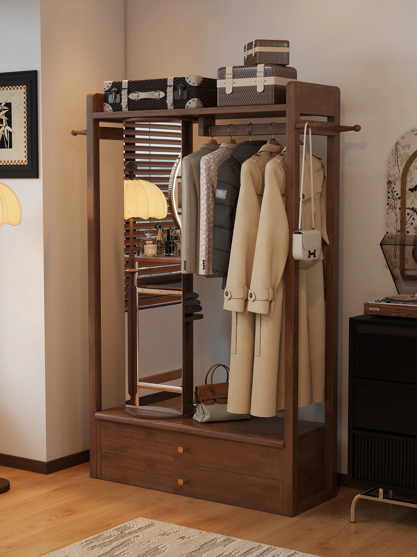 New Chinese Style Solid Wood Coat Rack with Integrated Dressing Mirror – Multifunctional Freestanding Clothes Hanger for Home Bedroom Use