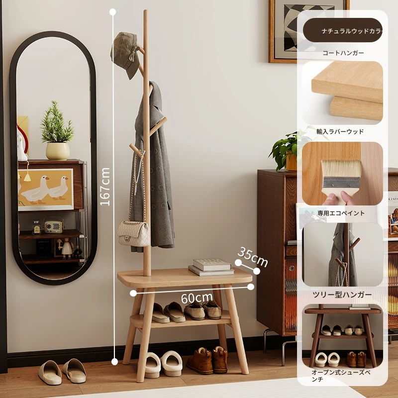 60cmナチュラルカラー【靴を履くベンチ+コートハンガー+靴棚】-送料無料