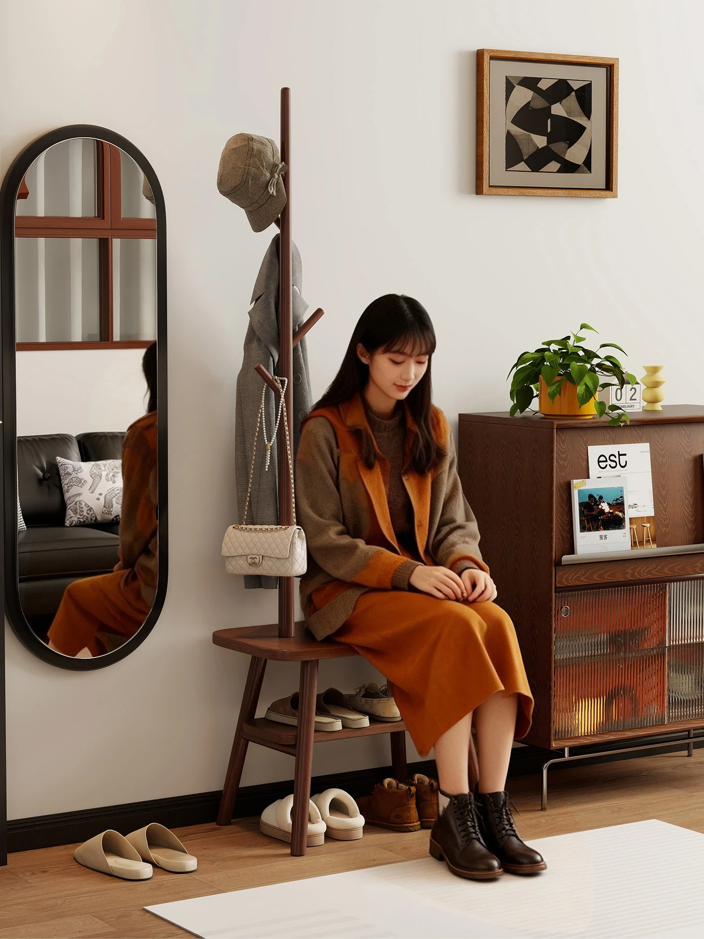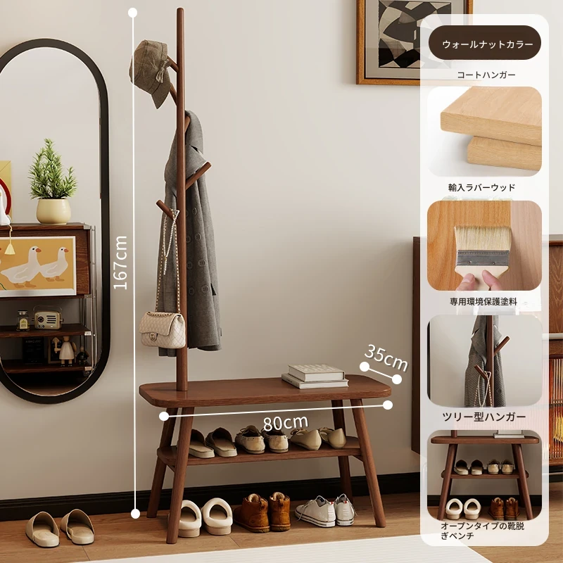 80cmウォールナットカラー【靴を履くベンチ+コートハンガー+靴棚】-送料無料