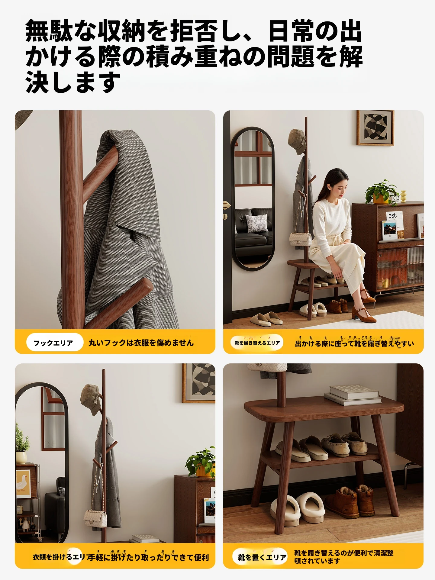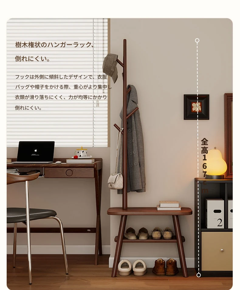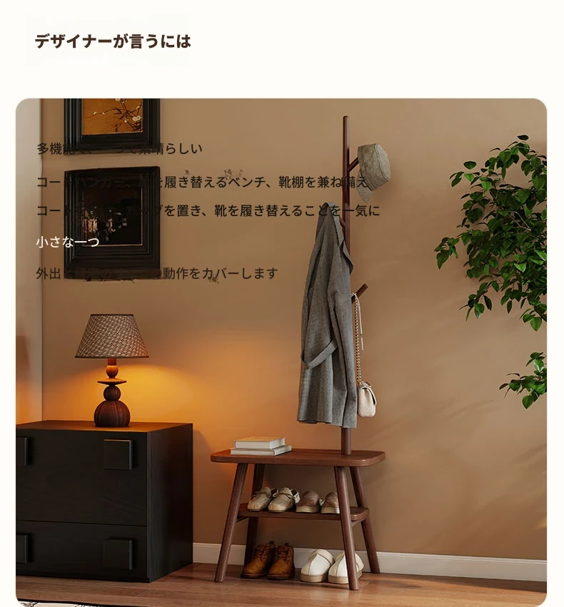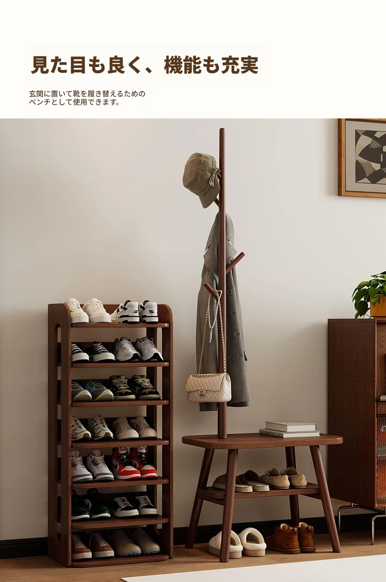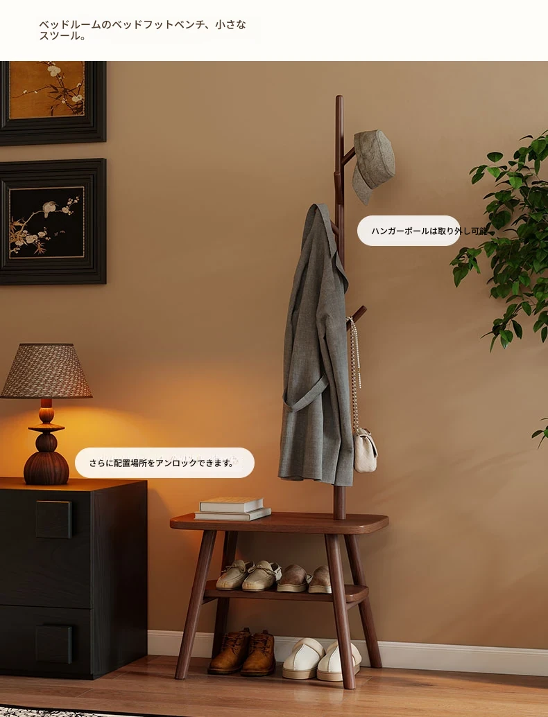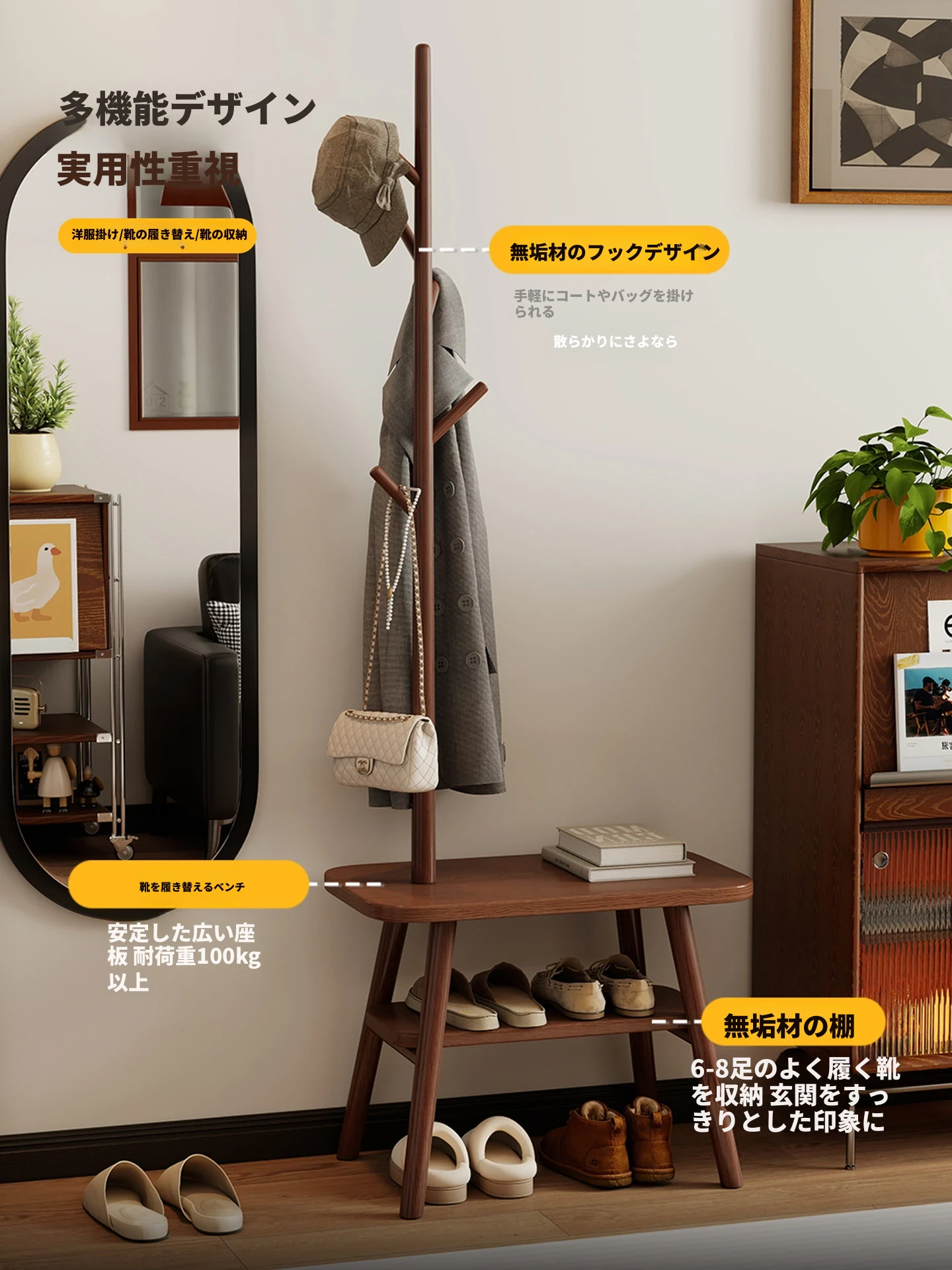 天然木製の靴ベンチ&ハンガーラック一体型!玄関やエントランスにぴったりのコンパクトサイズ。靴を履くのも楽々、収納力抜群のシューズキャビネットでおしゃれな空間を演出!
