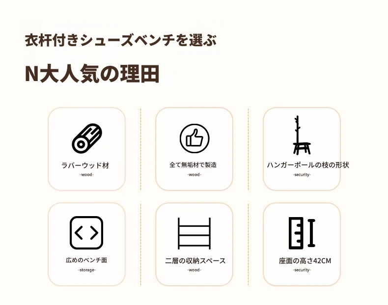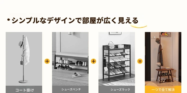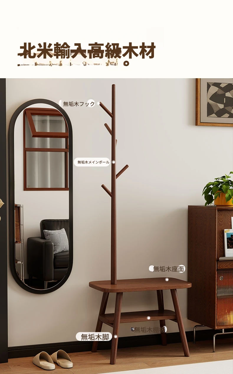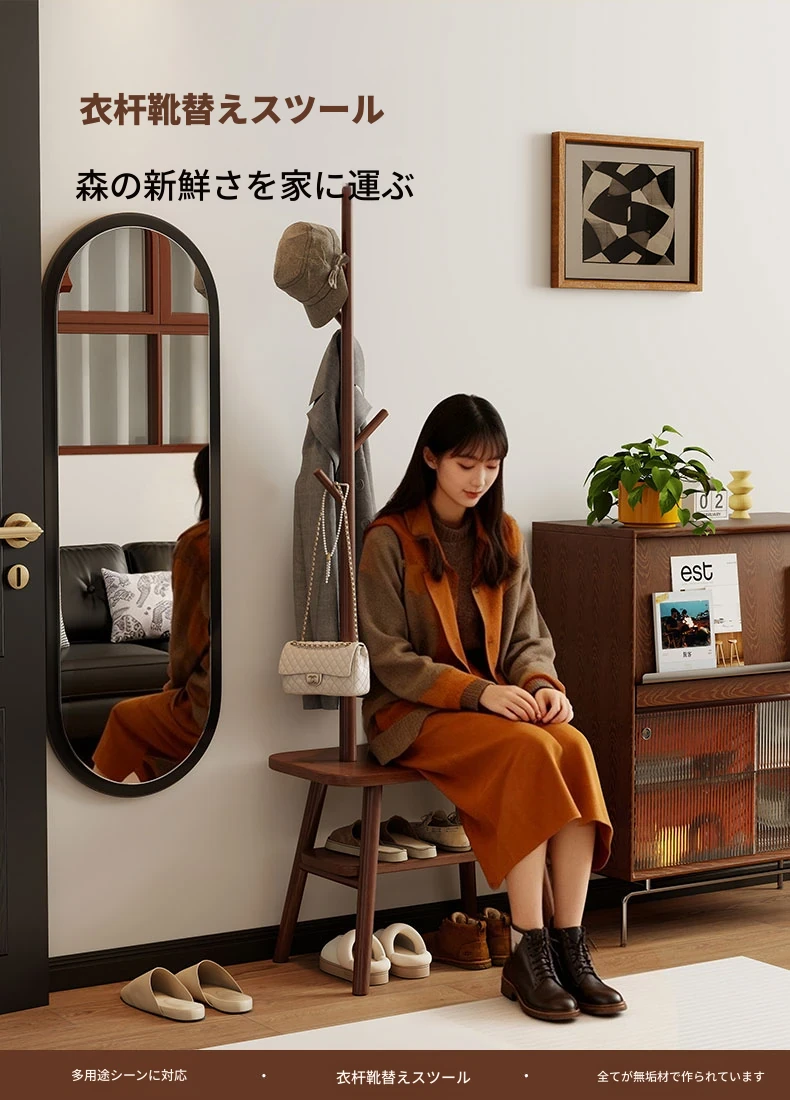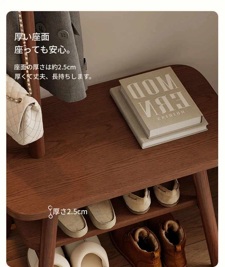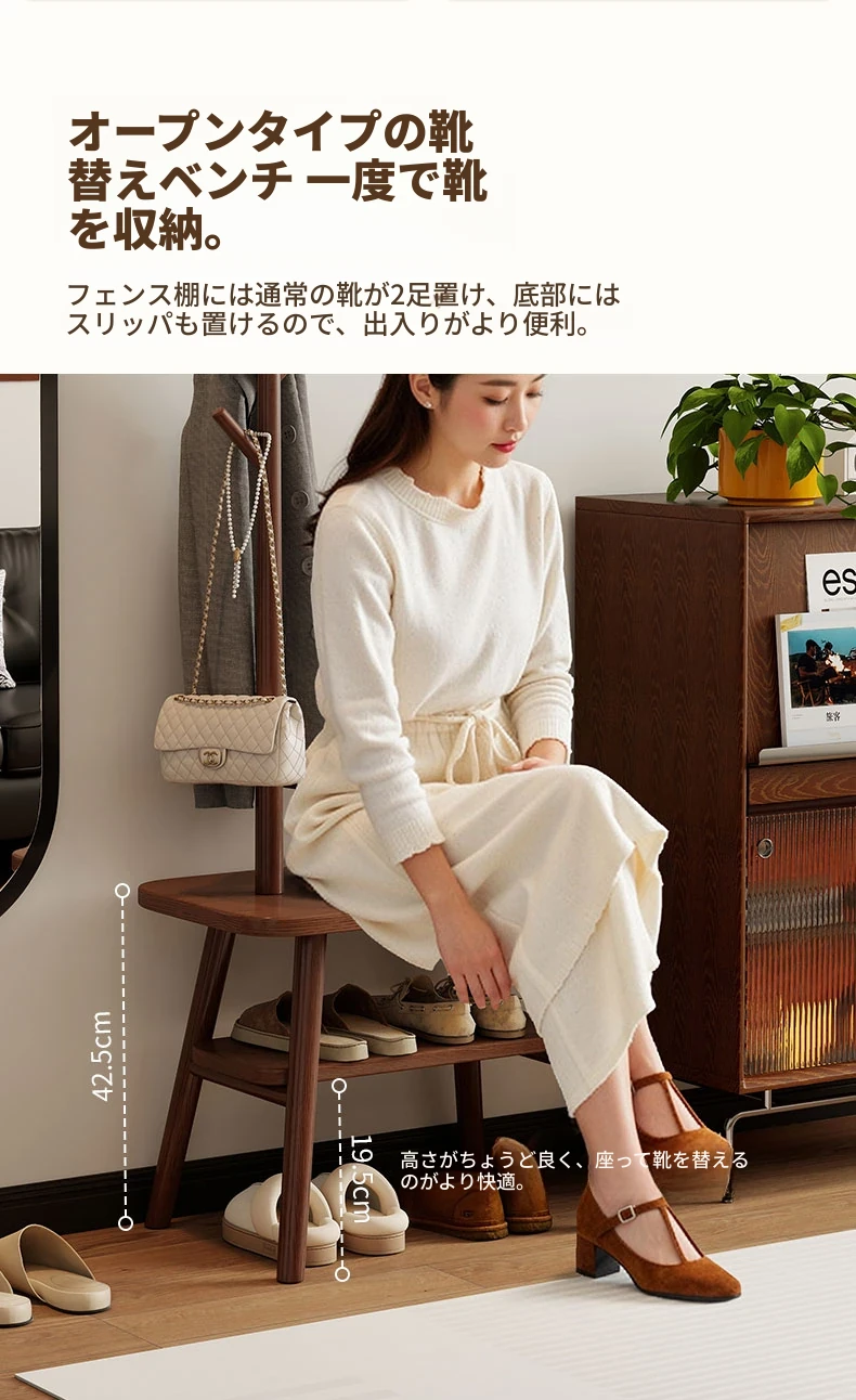 天然木製の靴ベンチ&ハンガーラック一体型!玄関やエントランスにぴったりのコンパクトサイズ。靴を履くのも楽々、収納力抜群のシューズキャビネットでおしゃれな空間を演出!