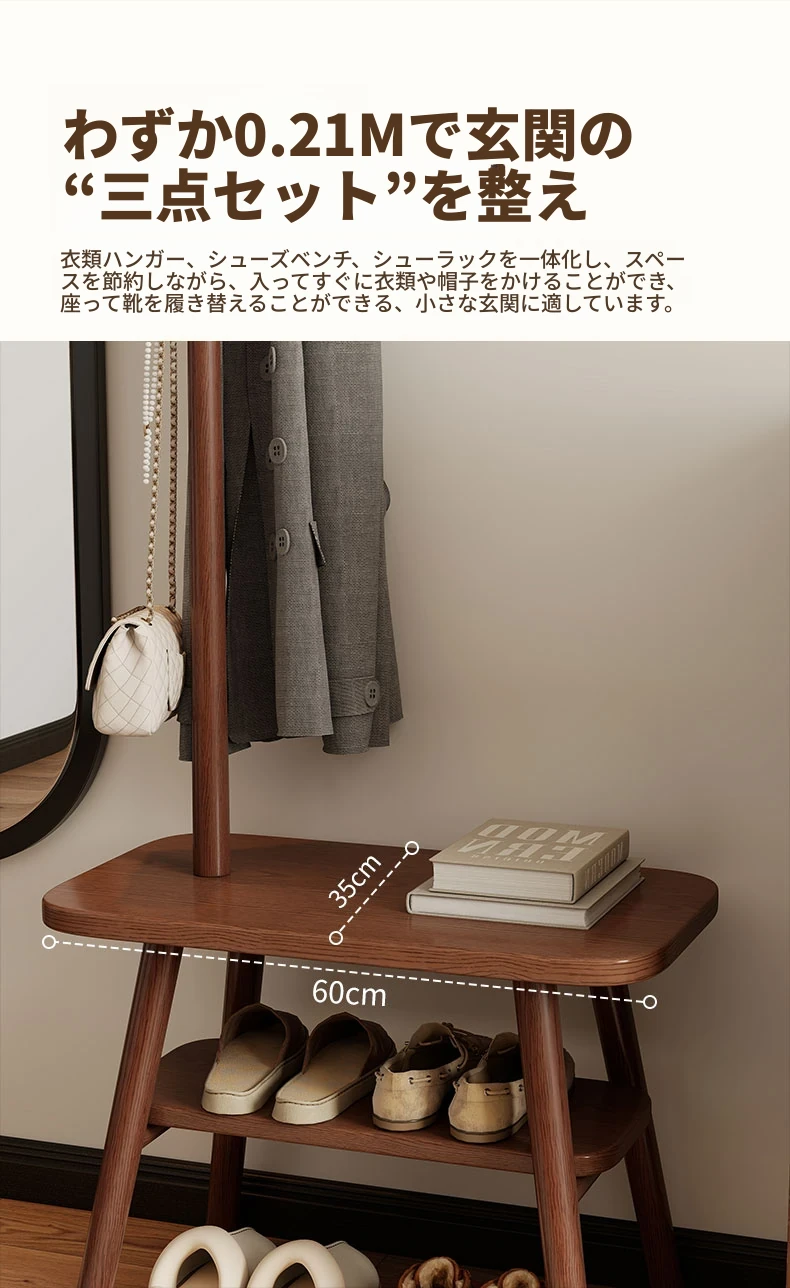 60cmウォールナットカラー【靴を履くベンチ+コートハンガー+靴棚】-送料無料
